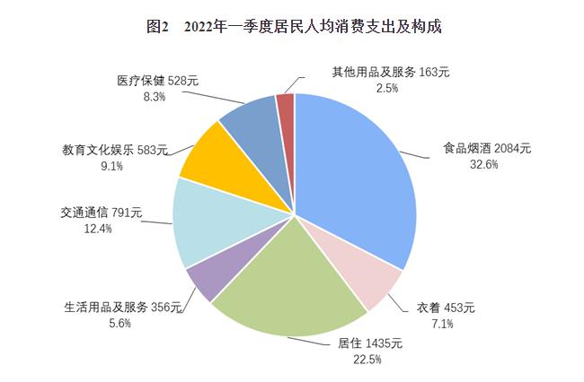 據(jù)悉,一季度,全國居民人均消費(fèi)支出6393元,比上年名義增長6.9%,扣除價(jià)格因素影響,實(shí)際增長5.7%。分城鄉(xiāng)看,城鎮(zhèn)居民人均消費(fèi)支出7924元,增長5.7%,扣除價(jià)格因素,實(shí)際增長4.4%;農(nóng)村居民人均消費(fèi)支出4388元,增長8.6%,扣除價(jià)格因素,實(shí)際增長7.8%。一季度,全國居民人均食品煙酒消費(fèi)支出2084元,增長4.9%,占人均消費(fèi)支出的比重為32.6%;人均衣著消費(fèi)支出453元,增長3.6%,占人均消費(fèi)支出的比重為7.1%;人均居住消費(fèi)支出1435元,增長6.7%,占人均消費(fèi)支出的比重為22.5%;人均生活用品及服務(wù)消費(fèi)支出356元,增長4.8%,占人均消費(fèi)支出的比重為5.6%;人均交通通信消費(fèi)支出791元,增長12.7%,占人均消費(fèi)支出的比重為12.4%;人均教育文化娛樂消費(fèi)支出583元,增長6.9%,占人均消費(fèi)支出的比重為9.1%;人均醫(yī)療保健消費(fèi)支出528元,增長9.1%,占人均消費(fèi)支出的比重為8.3%;人均其他用品及服務(wù)消費(fèi)支出163元,增長17.1%,占人均消費(fèi)支出的比重為2.5%。