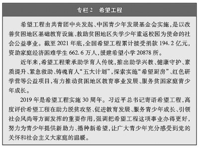 教育機(jī)會(huì)更加均等。中國教育事業(yè)優(yōu)先發(fā)展不斷深化,中國青年享有更加平等、更高質(zhì)量的教育機(jī)會(huì)。2021年,中國義務(wù)教育鞏固率達(dá)95.4%;高中階段毛入學(xué)率達(dá)91.4%;高等教育毛入學(xué)率達(dá)57.8%、在學(xué)總規(guī)模達(dá)4430萬人,居世界第一,越來越多的青年打開了通往成功成才大門的重要路徑。覆蓋學(xué)前教育至研究生教育的學(xué)生資助政策體系建成且日趨完善,2020年資助資金總額超過2400億元、資助學(xué)生近1.5億人次,實(shí)現(xiàn)“三個(gè)全覆蓋”②。義務(wù)教育階段進(jìn)城務(wù)工人員隨遷子女、農(nóng)村和貧困地區(qū)學(xué)生等群體受教育權(quán)益得到充分保障。2020年,85.8%的進(jìn)城務(wù)工人員隨遷子女在公辦學(xué)校就讀或享受政府購買學(xué)位服務(wù);2012年至2021年,農(nóng)村和貧困地區(qū)重點(diǎn)高校專項(xiàng)招生計(jì)劃定向招生超過82萬人,讓更多的青年公平享有接受更好教育的機(jī)會(huì),阻斷貧困的代際傳遞。
