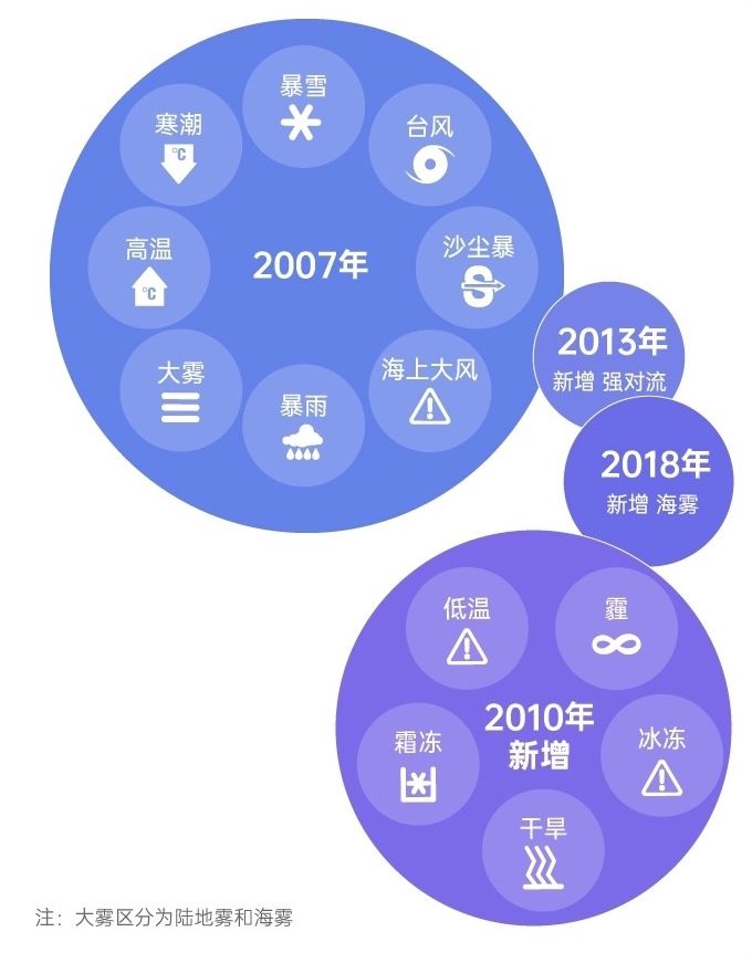 2007年,中國氣象局制定并發(fā)布《中央氣象臺(tái)氣象災(zāi)害警報(bào)發(fā)布辦法(試行)》,適用于8類氣象災(zāi)害預(yù)警;2010年,氣象災(zāi)害預(yù)警增至13類;2013年新增強(qiáng)對流預(yù)警發(fā)布辦法,至此氣象災(zāi)害預(yù)警增至14類。2018年,在大霧氣象災(zāi)害預(yù)警中還新增了海霧預(yù)警發(fā)布辦法。