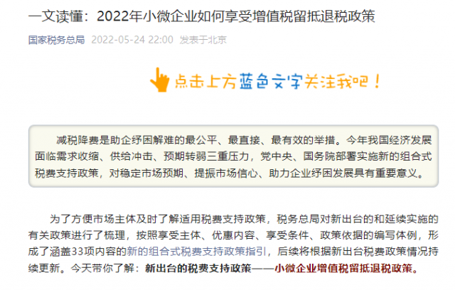 為了方便市場(chǎng)主體及時(shí)了解適用稅費(fèi)支持政策,稅務(wù)總局對(duì)新出臺(tái)的和延續(xù)實(shí)施的有關(guān)政策進(jìn)行了梳理,按照享受主體、優(yōu)惠內(nèi)容、享受條件、政策依據(jù)的編寫體例,形成了涵蓋33項(xiàng)內(nèi)容的新的組合式稅費(fèi)支持政策指引,后續(xù)將根據(jù)新出臺(tái)稅費(fèi)政策情況持續(xù)更新。今天帶你了解:新出臺(tái)的稅費(fèi)支持政策——小微企業(yè)增值稅留抵退稅政策。