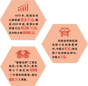 截至2020年年底,我國(guó)公路橋梁達(dá)91.28萬(wàn)座,其中特大橋6444座,不論在長(zhǎng)江、黃河等大江大河,還是泉州灣等海灣地區(qū),一座座施工難度大、技術(shù)含量高、在世界橋梁建設(shè)中具有代表性的橋梁成為閃亮的“中國(guó)名片”。