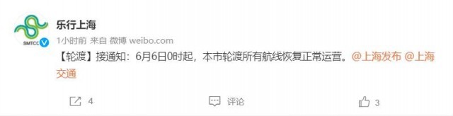 據(jù)上海市交通委員會交通指揮中心官方微博@樂行上海 消息,接通知:6月6日0時起,本市輪渡所有航線恢復(fù)正常運營。