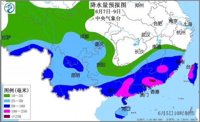7日至9日,湖南南部、江西中南部、福建、廣西、廣東、海南、臺(tái)灣及四川中南部、云南、貴州西部等地部分地區(qū)將有大雨或暴雨,局地大暴雨。廣西東部、廣東西南部和中東部、福建西南部和東部沿海、臺(tái)灣西部等地部分地區(qū)降雨量可達(dá)100~180毫米,局地200~300毫米;上述地區(qū)還將伴有短時(shí)強(qiáng)降水(最大小時(shí)降雨量30~50毫米、局地70毫米以上)、雷暴大風(fēng)等強(qiáng)對(duì)流天氣。