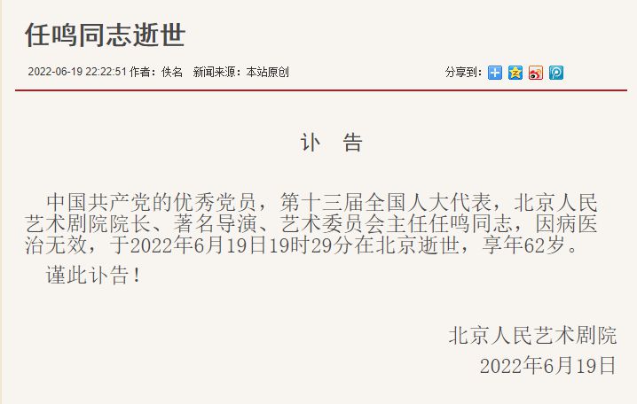 中國共產(chǎn)黨的優(yōu)秀黨員,第十三屆全國人大代表,北京人民藝術(shù)劇院院長、著名導(dǎo)演、藝術(shù)委員會(huì)主任任鳴同志,因病醫(yī)治無效,于2022年6月19日19時(shí)29分在北京逝世,享年62歲。
