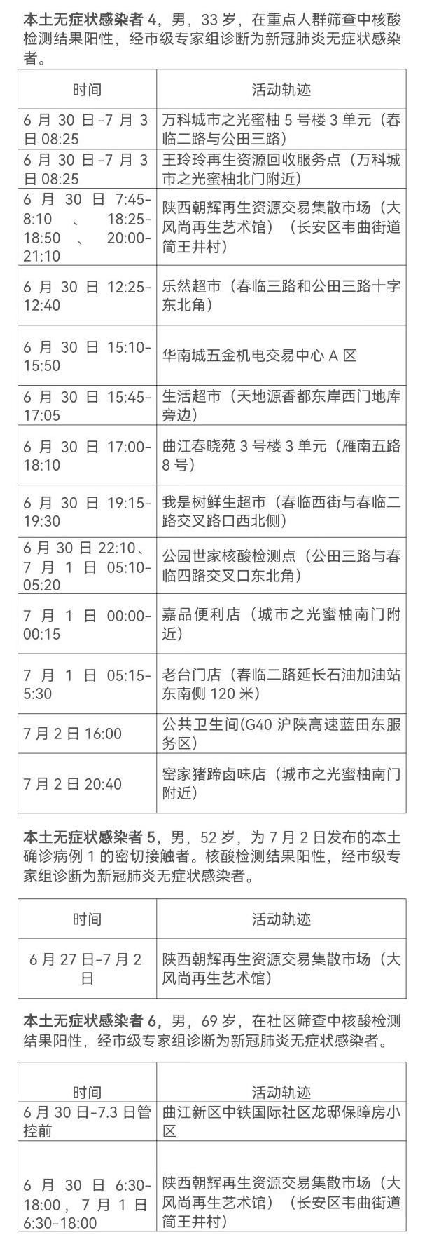 7月3日0-24時(shí),西安新增3例本土無癥狀感染者,2例在重點(diǎn)人群核酸檢測(cè)中發(fā)現(xiàn),1例在社區(qū)篩查中發(fā)現(xiàn)。主要活動(dòng)軌跡如下: