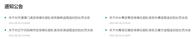 18日晚,中國足協(xié)網(wǎng)站發(fā)布4則球員、俱樂部官員違規(guī)違紀(jì)的處罰決定,中超天津津門虎球員楊帆、中超長春亞泰球員孫捷及中乙青島紅獅球員王建文均停賽5場,中甲遼寧沈陽城市足球俱樂部官員林濤6場比賽禁止進入體育場。處罰決定全文如下: