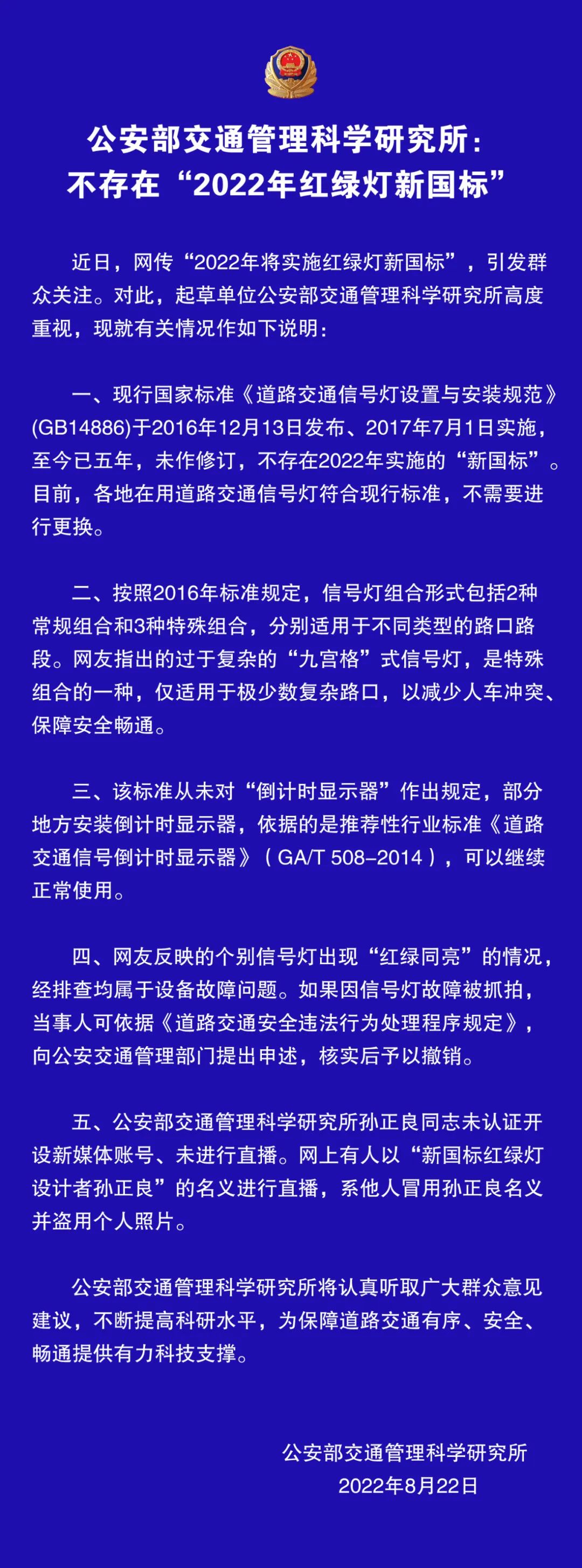 近日,網傳“2022年將實施紅綠燈新國標”,引發(fā)群眾關注。對此,起草單位公安部交通管理科學研究所高度重視,現(xiàn)就有關情況作如下說明:
