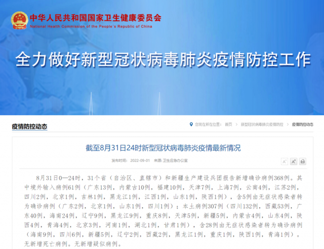 8月31日0—24時(shí),31個(gè)省(自治區(qū)、直轄市)和新疆生產(chǎn)建設(shè)兵團(tuán)報(bào)告新增確診病例368例。其中境外輸入病例61例(廣東13例,內(nèi)蒙古10例,福建10例,天津7例,上海7例,云南4例,江蘇2例,四川2例,北京1例,吉林1例,黑龍江1例,江西1例,山東1例,陜西1例),含5例由無癥狀感染者轉(zhuǎn)為確診病例(廣東2例,北京1例,山東1例,四川1例);本土病例307例(四川132例,西藏53例,廣東40例,海南24例,遼寧9例,黑龍江9例,重慶8例,天津5例,新疆5例,內(nèi)蒙古4例,山東4例,陜西4例,青海4例,北京3例,河南1例,湖北1例,甘肅1例),含28例由無癥狀感染者轉(zhuǎn)為確診病例(海南9例,四川6例,新疆5例,遼寧2例,西藏2例,黑龍江1例,重慶1例,陜西1例,青海1例)。無新增死亡病例。無新增疑似病例。