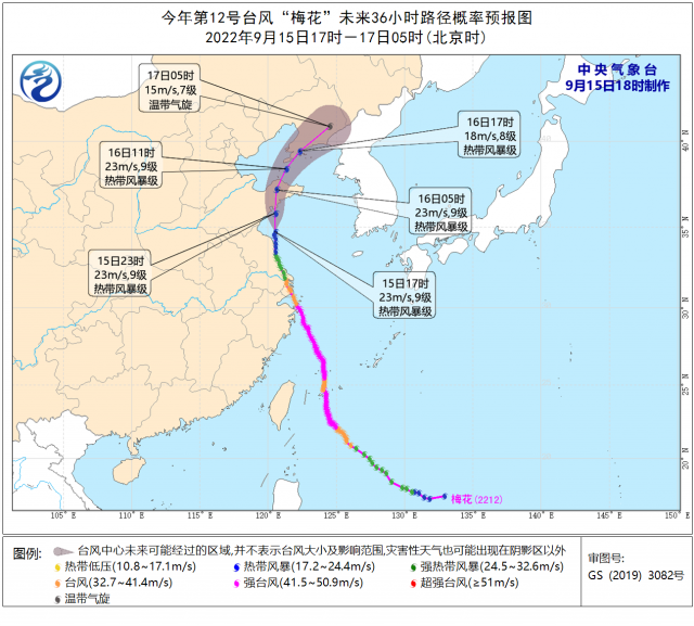 臺風(fēng)“梅花”移動路徑。中央氣象臺9月15日18時制作