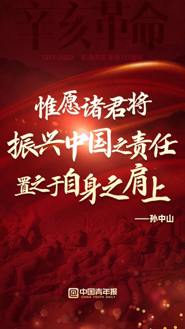 111年前,以孫中山先生為代表的革命黨人發(fā)動了辛亥革命,近代以來中國發(fā)生的深刻社會變革由此拉開新的一幕。今天,讓我們學習和弘揚革命先驅為振興中華而矢志不渝的崇高精神,為實現(xiàn)中華民族偉大復興而共同奮斗!