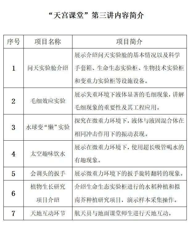 此次太空授課活動將繼續(xù)采取天地互動方式進行,3名航天員將在軌介紹展示中國空間站問天實驗艙工作生活場景,演示微重力環(huán)境下毛細效應實驗、水球變“懶”實驗、太空趣味飲水、會調(diào)頭的扳手以及植物生長研究項目介紹,并與地面課堂進行互動交流,旨在傳播普及載人航天知識,激發(fā)廣大青少年對科學的興趣。