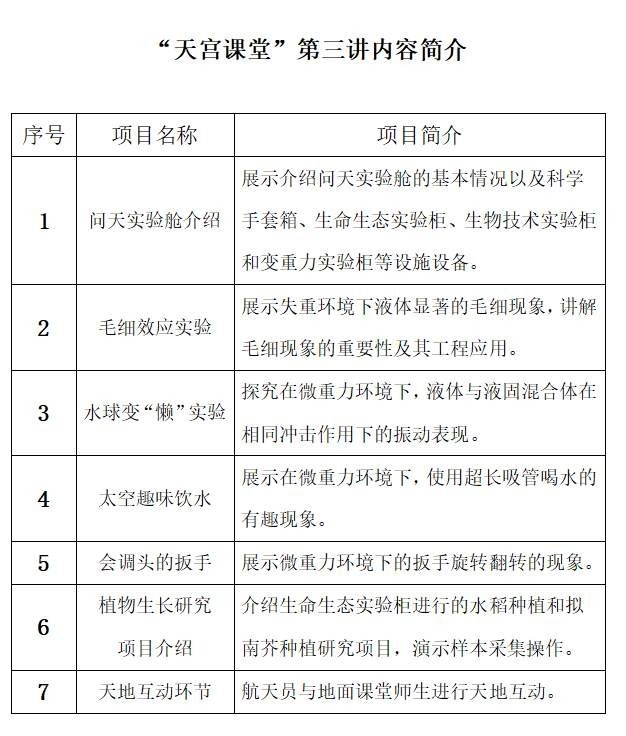 本次太空授課活動將繼續(xù)采取天地互動方式進行,3名航天員將在軌介紹展示中國空間站問天實驗艙工作生活場景,演示微重力環(huán)境下毛細效應(yīng)實驗、水球變“懶”實驗、太空趣味飲水、會調(diào)頭的扳手以及植物生長研究項目介紹,并與地面課堂進行互動交流,旨在傳播普及載人航天知識,激發(fā)廣大青少年對科學的興趣。