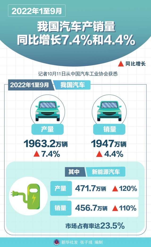 新華社北京10月11日電(記者高亢、戴小河)記者11日從中國汽車工業(yè)協(xié)會獲悉,今年1至9月,我國汽車產(chǎn)銷量分別達1963.2萬輛和1947萬輛,同比增長7.4%和4.4%。其中,新能源汽車產(chǎn)銷量分別達471.7萬輛和456.7萬輛,同比增長120%和110%,市場占有率達23.5%。