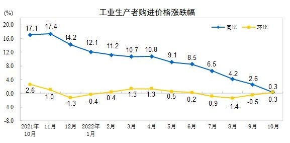 央視網(wǎng)消息:據(jù)國(guó)家統(tǒng)計(jì)局網(wǎng)站,2022年10月份,全國(guó)工業(yè)生產(chǎn)者出廠價(jià)格同比下降1.3%,環(huán)比上漲0.2%;工業(yè)生產(chǎn)者購(gòu)進(jìn)價(jià)格同比上漲0.3%,環(huán)比上漲0.3%。1—10月平均,工業(yè)生產(chǎn)者出廠價(jià)格比去年同期上漲5.2%,工業(yè)生產(chǎn)者購(gòu)進(jìn)價(jià)格上漲7.5%。