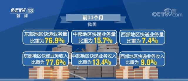 前11個月,我國東、中、西部地區(qū)快遞業(yè)務(wù)量比重分別為76.9%、15.7%和7.4%,業(yè)務(wù)收入比重分別為77.6%、13.4%和9.0%。與去年同期相比,東部地區(qū)快遞業(yè)務(wù)量比重下降1.3個百分點,快遞業(yè)務(wù)收入比重下降0.6個百分點。中部地區(qū)快遞業(yè)務(wù)量比重上升1.2個百分點,快遞業(yè)務(wù)收入比重上升0.5個百分點。西部地區(qū)快遞業(yè)務(wù)量比重上升0.1個百分點,快遞業(yè)務(wù)收入比重上升0.1個百分點。