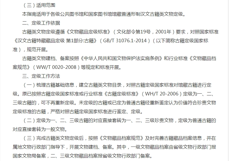 在定級(jí)工作依據(jù)中,古籍類文物定級(jí)遵循《文物藏品定級(jí)標(biāo)準(zhǔn)》(文化部令第19號(hào),2001年)要求,對(duì)照國(guó)家標(biāo)準(zhǔn)《漢文古籍特藏藏品定級(jí) 第1部分:古籍》(GB/T 31076.1-2014)(以下簡(jiǎn)稱古籍定級(jí)國(guó)家標(biāo)準(zhǔn)),規(guī)范開(kāi)展。