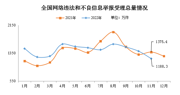 中央網信辦舉報中心近日公布的統(tǒng)計數據顯示,2022年11月,中央網信辦舉報中心指導全國各級網信舉報工作部門、主要網站平臺受理舉報1188.3萬件,環(huán)比下降15.1%、同比下降13.6%。