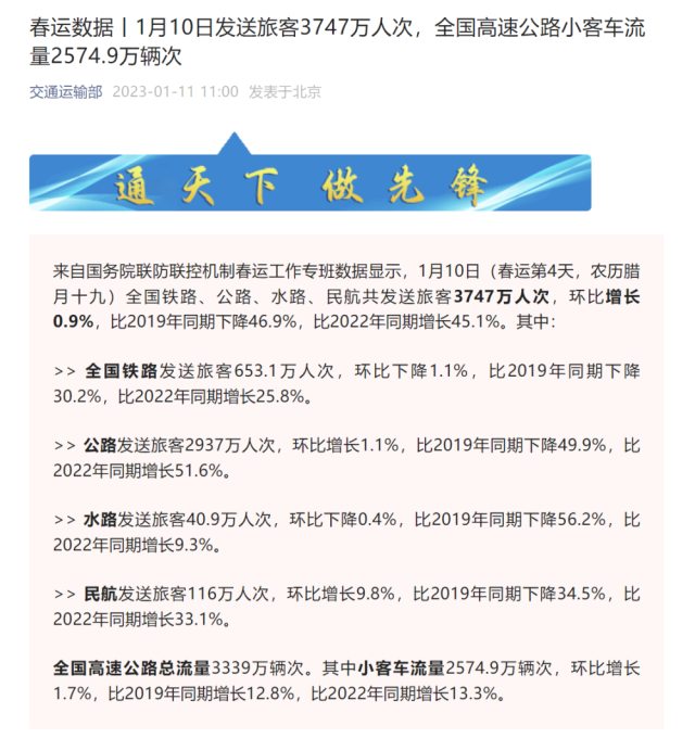 來(lái)自國(guó)務(wù)院聯(lián)防聯(lián)控機(jī)制春運(yùn)工作專班數(shù)據(jù)顯示,1月10日(春運(yùn)第4天,農(nóng)歷臘月十九)全國(guó)鐵路、公路、水路、民航共發(fā)送旅客3747萬(wàn)人次,環(huán)比增長(zhǎng)0.9%,比2019年同期下降46.9%,比2022年同期增長(zhǎng)45.1%。其中: