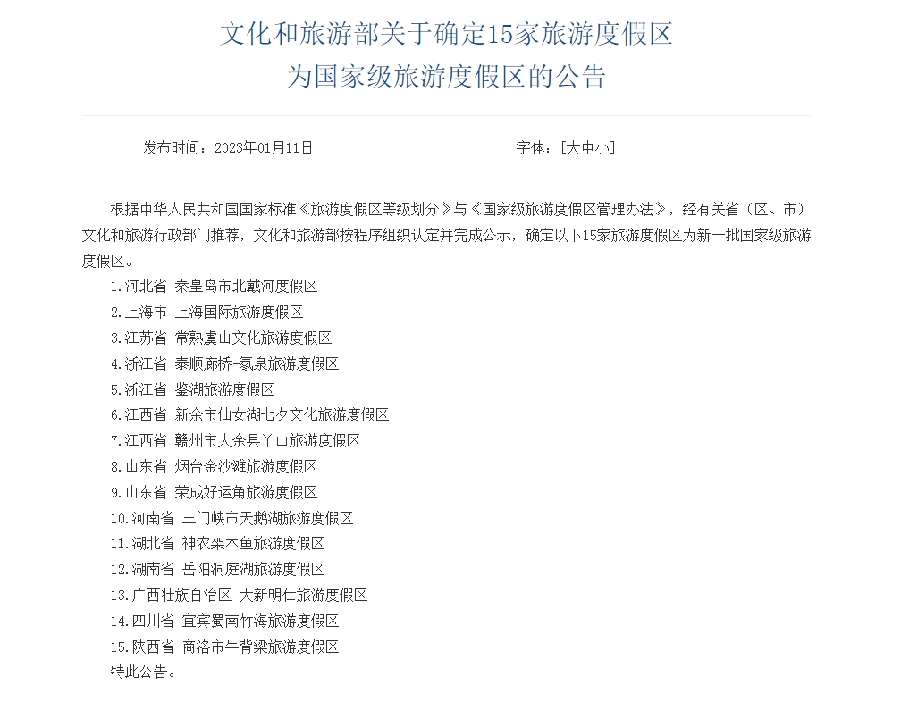 中新網(wǎng)1月11日電 據(jù)文旅部網(wǎng)站顯示,根據(jù)中華人民共和國國家標準《旅游度假區(qū)等級劃分》與《國家級旅游度假區(qū)管理辦法》,經(jīng)有關省(區(qū)、市)文化和旅游行政部門推薦,文化和旅游部按程序組織認定并完成公示,確定以下15家旅游度假區(qū)為新一批國家級旅游度假區(qū):