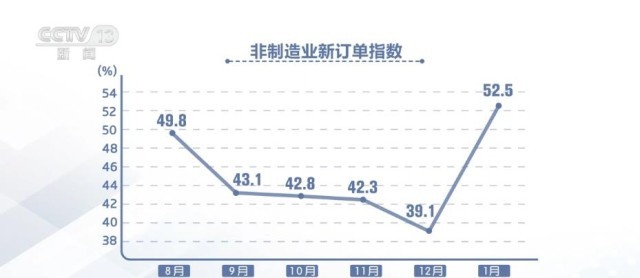 1月份中國非制造業(yè)商務(wù)活動指數(shù)為54.4%,較上月上升12.8個百分點,結(jié)束連續(xù)6個月下降走勢;新訂單指數(shù)為52.5%,較上月上升13.4個百分點,結(jié)束連續(xù)4個月下降走勢。非制造業(yè)供需呈現(xiàn)加速回升跡象。