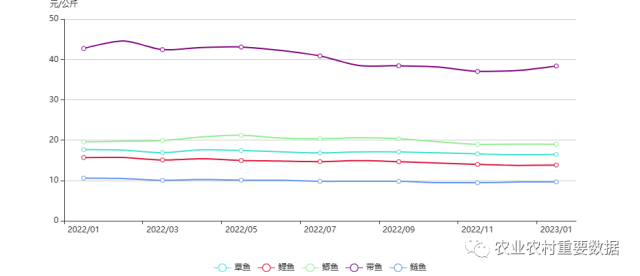 2023年1月,帶魚(yú)批發(fā)價(jià)格為38.41元/公斤,比上月上漲3.03%;草魚(yú)、鯉魚(yú)、鯽魚(yú)和鰱魚(yú)批發(fā)價(jià)格分別為16.47元/公斤、13.84元/公斤、18.98元/公斤、9.66元/公斤,與上月基本持平。