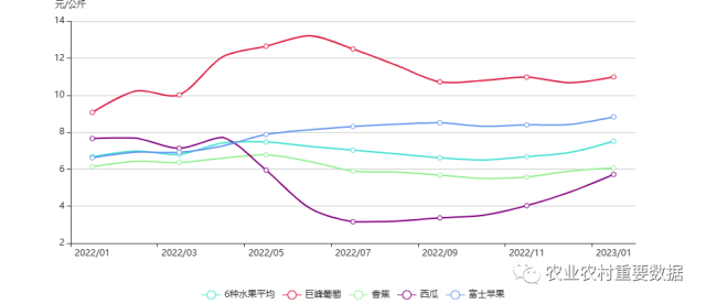 2023年1月,6種水果平均批發(fā)價(jià)格為7.51元/公斤,環(huán)比上漲8.68%,其中:巨峰葡萄、香蕉、西瓜和富士蘋(píng)果批發(fā)價(jià)格分別為10.99元/公斤、6.07元/公斤、5.72元/公斤、8.83元/公斤,比上月分別上漲2.90%、2.88%、19.92%、4.87%。