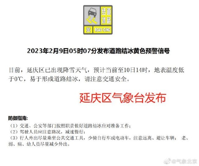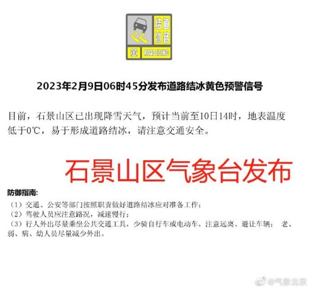 另外,目前石景山、門頭溝、延慶區(qū)氣象臺(tái)已發(fā)布道路結(jié)冰黃色預(yù)警信號(hào),上述區(qū)域已出現(xiàn)降雪,易形成道路結(jié)冰,請(qǐng)大家出行注意交通安全。