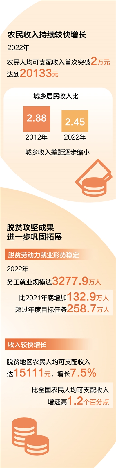 增加農(nóng)民收入是“三農(nóng)”工作的中心任務(wù)。2022年,農(nóng)民人均可支配收入首次突破2萬元,城鄉(xiāng)居民收入比從2012年的2.88下降到2022年的2.45,城鄉(xiāng)收入差距逐步縮小?!耙惨吹?,當前農(nóng)民收入增速有所放緩,增收動能有所減弱。必須高度重視,拿出長短結(jié)合、務(wù)實管用的硬措施,拓寬農(nóng)民增收致富渠道?!敝醒朕r(nóng)辦專職副主任、農(nóng)業(yè)農(nóng)村部黨組成員吳宏耀說。對此,今年中央一號文件在穩(wěn)定就業(yè)、經(jīng)營增效、挖潛財產(chǎn)收入以及拓展轉(zhuǎn)移收入等方面作出相關(guān)部署,努力讓農(nóng)民腰包越來越鼓,日子越過越紅火。