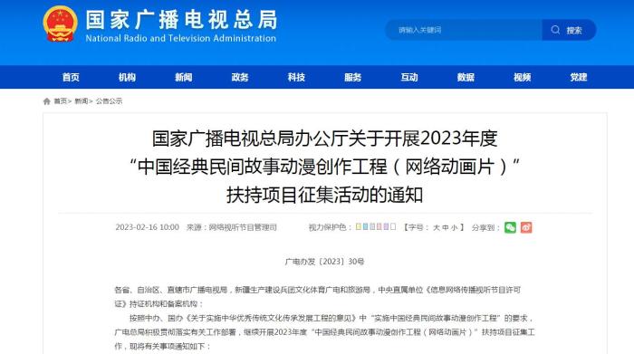 中新網(wǎng)2月16日電 16日,國家廣播電視總局辦公廳發(fā)布關于開展2023年度“中國經(jīng)典民間故事動漫創(chuàng)作工程(網(wǎng)絡動畫片)”扶持項目征集活動的通知,旨在打造廣受觀眾認可、具有較大影響力的優(yōu)秀作品。