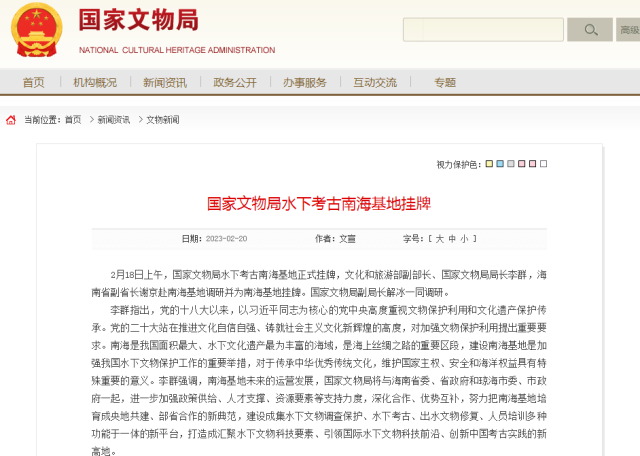文化和旅游部副部長、國家文物局局長李群表示,南海是我國面積最大、水下文化遺產最為豐富的海域,是海上絲綢之路的重要區(qū)段。國家文物局將努力把南?;嘏嘤裳氲毓步ā⒉渴『献鞯男碌浞?,建設成集水下文物調查保護、水下考古、出水文物修復、人員培訓多種功能于一體的新平臺,打造成匯聚水下文物科技要素、引領世界水下文物科技前沿、創(chuàng)新中國考古實踐的新高地。