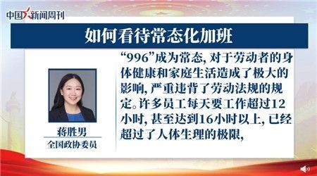 全國(guó)政協(xié)委員、編劇蔣勝男建議加強(qiáng)勞動(dòng)法對(duì)勞動(dòng)者的休息權(quán)保護(hù),對(duì)企事業(yè)單位八小時(shí)工作制的執(zhí)行情況加強(qiáng)監(jiān)督管理。