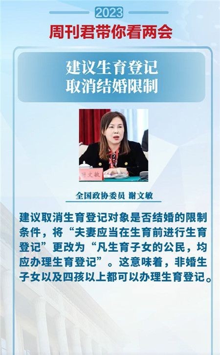 謝文敏建議,取消生育登記對(duì)象是否結(jié)婚的限制條件,將“夫妻應(yīng)當(dāng)在生育前進(jìn)行生育登記”更改為“凡生育子女的公民,均應(yīng)辦理生育登記”。這意味著,非婚生子女以及四孩以上都可以辦理生育登記。