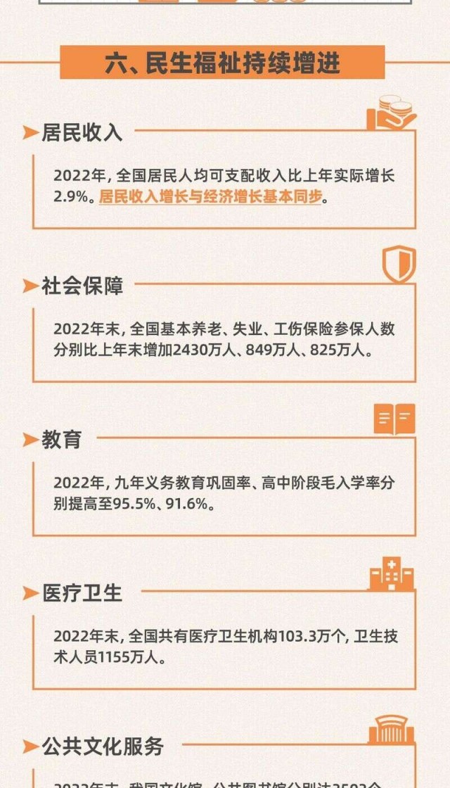 今日,國家統(tǒng)計(jì)局發(fā)布2022年國民經(jīng)濟(jì)和社會(huì)發(fā)展統(tǒng)計(jì)公報(bào)。初步核算,經(jīng)濟(jì)總量突破120萬億元,再上新臺(tái)階;全年糧食產(chǎn)量連續(xù)8年穩(wěn)定在1.3萬億斤以上;全部工業(yè)增加值首次超過40萬億元;全國城鎮(zhèn)新增就業(yè)1206萬人,超額完成年度目標(biāo)任務(wù);CPI月度漲幅始終低于3%;貨物進(jìn)出口總額首次突破40萬億元大關(guān);引資規(guī)模再創(chuàng)新高;全國居民人均可支配收入實(shí)際增長2.9%......轉(zhuǎn)存圖解,看看這些數(shù)字背后2022年的中國。