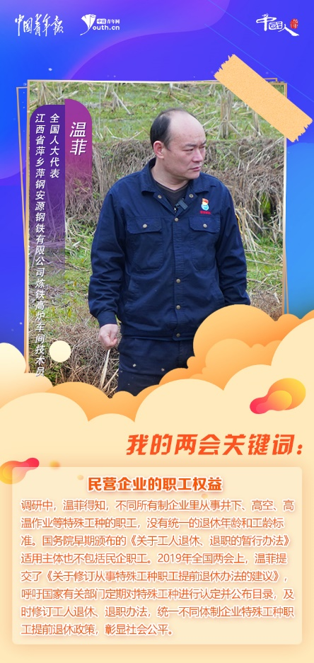 民營企業(yè)的職工權(quán)益,一直是溫菲關(guān)注的焦點(diǎn)。調(diào)研中,溫菲得知,不同所有制企業(yè)里從事井下、高空、高溫作業(yè)等特殊工種的職工,沒有統(tǒng)一的退休年齡和工齡標(biāo)準(zhǔn)。國務(wù)院早期頒布的《關(guān)于工人退休、退職的暫行辦法》適用主體也不包括民企職工。2019年全國兩會上,溫菲提交了《關(guān)于修訂從事特殊工種職工提前退休辦法的建議》,呼吁國家有關(guān)部門定期對特殊工種進(jìn)行認(rèn)定并公布目錄,及時修訂工人退休、退職辦法,統(tǒng)一不同體制企業(yè)特殊工種職工提前退休政策,彰顯社會公平。