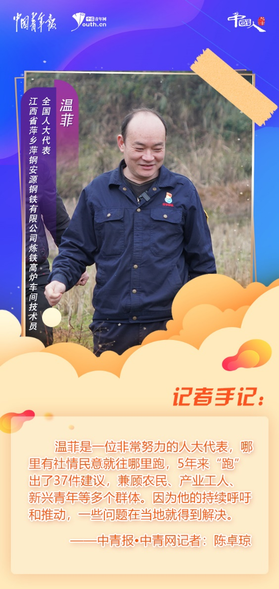 溫菲是一位非常努力的人大代表,哪里有社情民意就往哪里跑,5年來“跑”出了37件建議,兼顧農(nóng)民、產(chǎn)業(yè)工人、新興青年等多個群體。因?yàn)樗某掷m(xù)呼吁和推動,一些問題在當(dāng)?shù)鼐偷玫浇鉀Q。