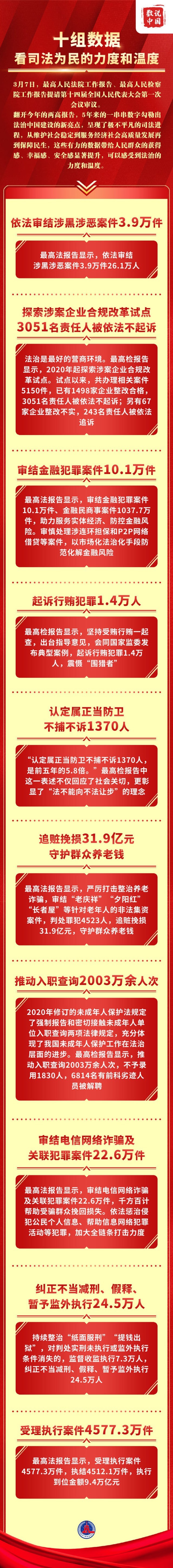 翻開今年的兩高報(bào)告,5年來的一串串?dāng)?shù)字勾勒出法治中國建設(shè)的新亮點(diǎn),呈現(xiàn)了極不平凡的司法進(jìn)程,從維護(hù)社會(huì)穩(wěn)定到服務(wù)經(jīng)濟(jì)社會(huì)高質(zhì)量發(fā)展再到保障民生,這些有力的數(shù)據(jù)帶給人民群眾的獲得感、幸福感、安全感顯著提升,可以感受到法治的力度和溫度。