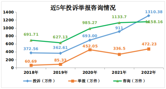 市場監(jiān)管總局今天發(fā)布數(shù)據(jù)顯示,2022年,全國市場監(jiān)管部門通過全國12315平臺、電話、傳真、窗口等渠道共受理消費者投訴、舉報和咨詢2940.77萬件,同比增長23.5%。其中,投訴1310.38萬件,舉報472.23萬件,為消費者挽回經濟損失45.19億元,有力保護了消費者合法權益。