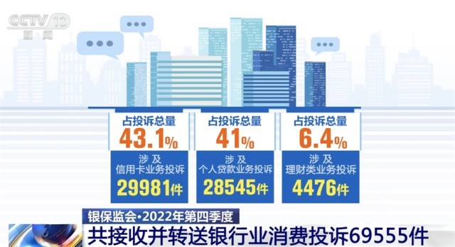 2022年第四季度,中國銀保監(jiān)會及其派出機(jī)構(gòu)共接收并轉(zhuǎn)送銀行業(yè)消費(fèi)投訴69555件。其中,涉及信用卡業(yè)務(wù)投訴29981件,占投訴總量的43.1%;涉及個人貸款業(yè)務(wù)投訴28545件,占投訴總量的41%;涉及理財類業(yè)務(wù)投訴4476件,占投訴總量的6.4%。