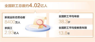 本報(bào)北京3月26日電 (記者易舒冉)記者日前從中華全國(guó)總工會(huì)獲悉:第九次全國(guó)職工隊(duì)伍狀況調(diào)查已于近期結(jié)束,調(diào)查表明,目前全國(guó)職工總數(shù)4.02億人左右,新就業(yè)形態(tài)勞動(dòng)者8400萬人,農(nóng)民工2.93億人;職工平均年齡38.3歲、平均受教育年限13.8年。調(diào)查還顯示,職工理想信念更加堅(jiān)定,主人翁地位持續(xù)鞏固,越來越多的職工積極投身“當(dāng)好主人翁、建功新時(shí)代”“建功‘十四五’、奮進(jìn)新征程”等主題勞動(dòng)和技能競(jìng)賽。