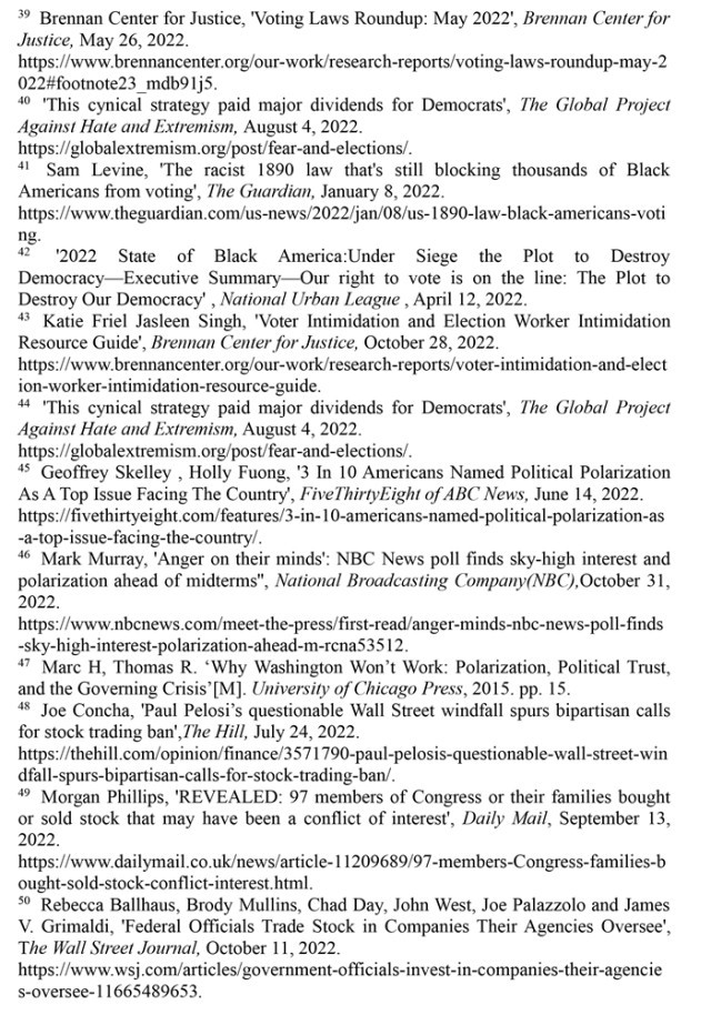 多重手法并用操弄選舉結(jié)果。“許多美國人完全摒棄了平等的觀念,而常常正是由這些摒棄平等觀念的人制定他人不得不遵守的規(guī)則。”(注38)限制選民投票資格的法律頻繁出臺。布倫南司法中心2022年5月26日發(fā)表的研究指出,2021年美國有18個州通過了34項限制投票的法律。在2022年的立法季,有39個州的立法機(jī)關(guān)審議了至少393項限制性法案,通過設(shè)置一系列投票障礙,極大地制約了有色人種選民行使投票權(quán)。亞利桑那州頒布了規(guī)制選民登記中提供身份證明文件的法律,多達(dá)20萬名選民可能面臨被取消登記的風(fēng)險。(注39)“全球反對仇恨和極端主義組織”2022年8月4日發(fā)表題為《美國人的恐懼感抑制民主參與》的報告指出,40%的非洲裔和37%的拉美裔美國人擔(dān)心被剝奪投票權(quán)利。(注40)英國《衛(wèi)報》網(wǎng)站2022年1月8日發(fā)表題為《1890年的種族主義法律仍在阻止成千上萬的美國黑人投票》的文章指出,嚴(yán)苛的投票資格法律阻止了密西西比州近16%適齡投票的非洲裔美國人進(jìn)行投票。該州作為非洲裔最集中的地區(qū)之一,一個多世紀(jì)以來從未選舉出一名非洲裔擔(dān)任公職。(注41)“美國城市聯(lián)盟”2022年4月12日發(fā)布《2022年非洲裔美國人狀況報告:摧毀民主的陰謀籠罩之下》指出,過去一年,有20個州利用人口普查數(shù)據(jù)重新劃分選區(qū),剝奪了非洲裔等大量少數(shù)族裔選民的投票權(quán)。(注42)這些操縱選舉的手段變相剝奪了大量選民的投票資格,平等的選舉權(quán)名存實(shí)亡。