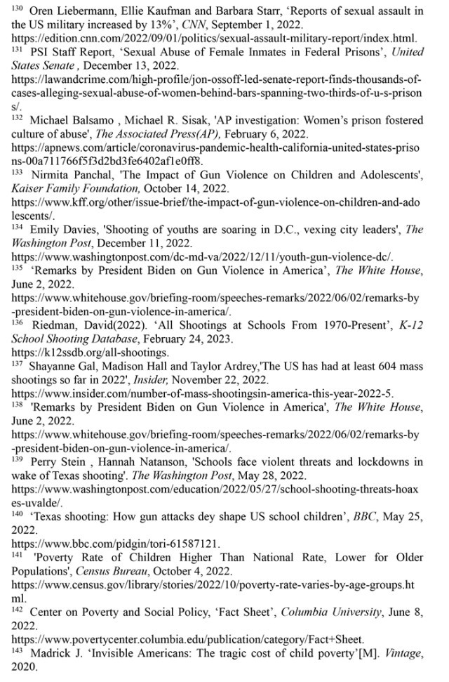 婦女墮胎失去憲法保護(hù),兒童生存環(huán)境令人擔(dān)憂。美國聯(lián)邦最高法院推翻“羅伊訴韋德案”的裁決終結(jié)了近50年來受憲法保護(hù)的墮胎權(quán),是對婦女人權(quán)和性別平等的巨大打擊。2022年美國有超過5800名18歲以下的兒童因槍擊受傷或死亡,校園槍擊事件數(shù)量高達(dá)302起,創(chuàng)1970年以來的最高值。美國兒童貧困率從2021年12月的12.1%上升至2022年5月的16.6%,增加了330萬貧困兒童。2018年以來被非法雇用的童工激增近70%,2022財年受雇專門從事危險工作的兒童增加了26%。