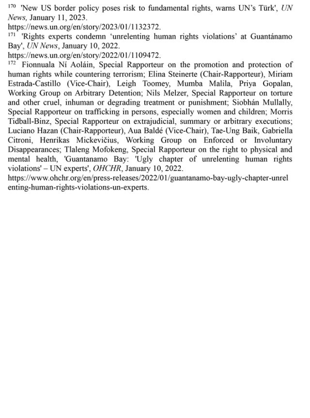 拒不關(guān)閉關(guān)塔那摩監(jiān)獄。2002年設(shè)立的關(guān)塔那摩監(jiān)獄最多時曾關(guān)押約780人,其中大多數(shù)人未經(jīng)審判便遭拘留,受到了殘忍的、不人道的待遇,是美國“肆意侵犯人權(quán)的一個丑陋篇章”。(注171)聯(lián)合國人權(quán)理事會在反恐中促進(jìn)和保障人權(quán)問題特別報告員菲奧努阿拉·尼奧萊因等多名獨(dú)立專家2022年1月發(fā)表共同聲明指出,臭名昭著的關(guān)塔那摩監(jiān)獄是美國在人權(quán)保護(hù)上的污點(diǎn),要求美國政府關(guān)閉關(guān)塔那摩監(jiān)獄,對遭受酷刑、任意拘留的公民進(jìn)行賠償,并根據(jù)國際法追究授權(quán)和實(shí)施酷刑的人員的責(zé)任。(注172)