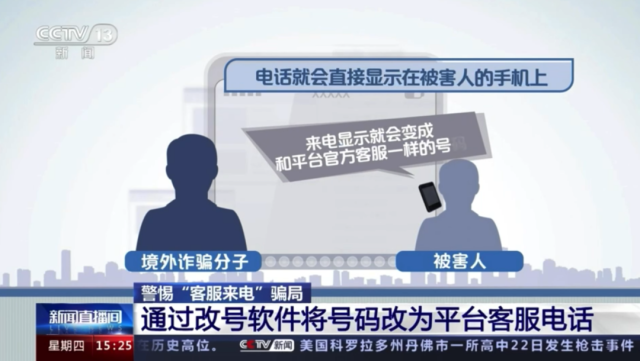第三步,當(dāng)被害人接到電話時,手機上顯示的就是和國內(nèi)一些知名平臺、手機APP客服電話一模一樣的電話號碼。有的被害人因為手機安裝了號碼識別軟件,接到這樣的詐騙電話,甚至?xí)蛔詣幼R別匹配出平臺名稱,顯示在被害人的手機上,繼而一步步陷入“冒充客服”詐騙的陷阱。