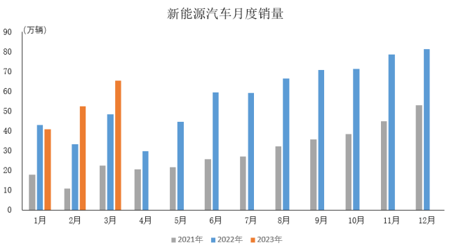 2023年3月,新能源汽車產(chǎn)銷分別完成67.4萬(wàn)輛和65.3萬(wàn)輛,環(huán)比分別增長(zhǎng)22%和24.4%,同比分別增長(zhǎng)44.8%和34.8%。