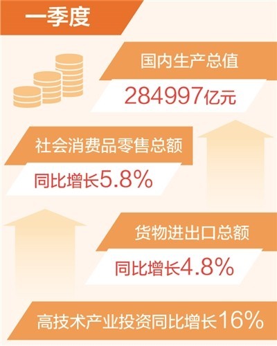 國(guó)內(nèi)需求逐步擴(kuò)大。一季度,社會(huì)消費(fèi)品零售總額同比增長(zhǎng)5.8%,服務(wù)零售額保持兩位數(shù)增長(zhǎng)。一季度,固定資產(chǎn)投資同比增長(zhǎng)5.1%,與上年全年持平。