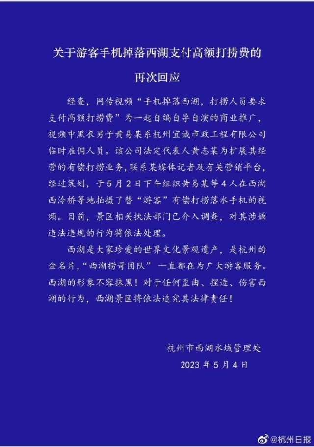 5月4日,杭州西湖水域管理處再次回應(yīng)“高價(jià)撈手機(jī)事件”:經(jīng)查,網(wǎng)傳視頻“手機(jī)掉落西湖,打撈人員要求支付高額打撈費(fèi)”為一起自編自導(dǎo)自演的商業(yè)推廣,視頻中黑衣男子黃易某系杭州宜誠市政工程有限公司臨時(shí)雇傭人員。該公司法定代表人黃志某為擴(kuò)展其經(jīng)營的有償打撈業(yè)務(wù),聯(lián)系某媒體記者及有關(guān)營銷平臺經(jīng)過策劃,于5月2日下午組織黃易某等4人在西湖西冷橋等地拍攝了替“游客”有償打撈落水手機(jī)的視頻。目前,景區(qū)相關(guān)執(zhí)法部門已介入調(diào)查,對其涉嫌違法違規(guī)的行為將依法處理。西湖是大家珍愛的世界文化景觀遺產(chǎn),是杭州的金名片,“西湖撈哥團(tuán)隊(duì)”一直都在為廣大游客服務(wù)。西湖的形象不容抹黑!對于任何歪曲、捏造、傷害西湖的行為,西湖景區(qū)將依法追究其法律責(zé)任!