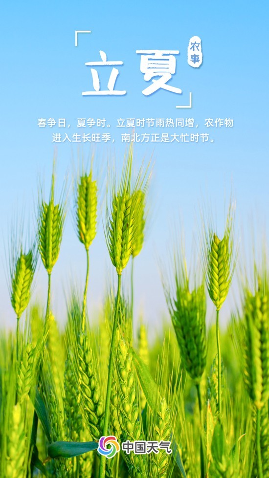 如果說春是生的季節(jié),那么夏就是長的季節(jié)?!稓v書》曰:“斗指東南,維為立夏,萬物至此皆長大,故名立夏也?!绷⑾?,是標示萬物進入旺季生長的一個重要節(jié)氣。此時,日照增加、氣溫漸升、雷雨增多,農(nóng)作物進入了茁壯成長階段。春播作物漸漸長大,夏收作物進入生長后期,冬小麥揚花灌漿,油菜接近成熟,大江南北都進入了農(nóng)事繁忙時期。