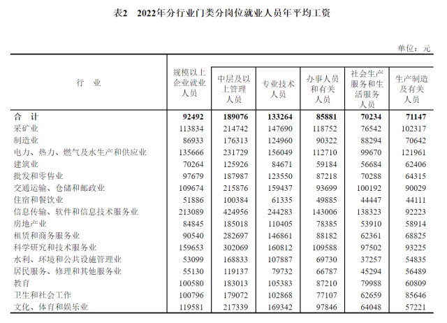 2022年分行業(yè)門類分崗位就業(yè)人員年平均工資。來(lái)源:國(guó)家統(tǒng)計(jì)局