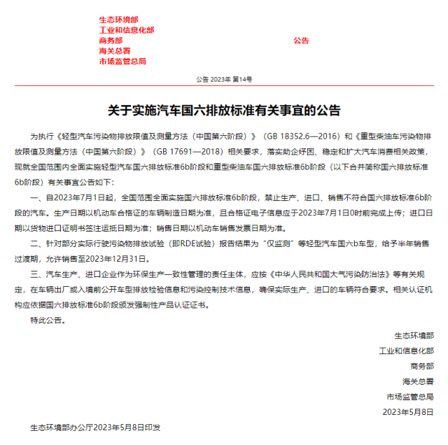 生態(tài)環(huán)境部辦公廳2023年5月8日印發(fā)關于實施汽車國六排放標準有關事宜的公告: