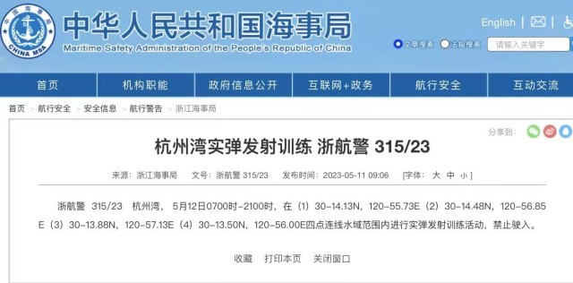 據中國海事局網站消息,浙江海事局發(fā)布航行警告,5月12日7時至21時,杭州灣部分水域進行實彈發(fā)射訓練活動,禁止駛入。